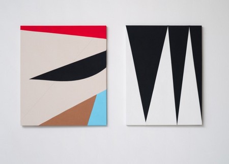 Sarah Crowner, Demi-Pli�e 1, 2012; Zig-Zag, 2012 Oil, gouache and stitching on canvas 106 x 91cm; 106.5 x 81cm | |||