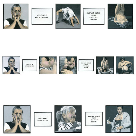 P�P�O�W Gallery is pleased to announce our eighth solo exhibition with Dotty Attie. This new series of paintings continues to expand on themes that Attie has brought to her work through the past 30 years: gender, politics, and how images often change the context of words. Reminiscent of silent films, each sequence is a still in the life of a boy or a girl whose mother is trying to warn them of their futures if they continue their current behavior. The statement, "Keep That Up Her Mother Said" and conversely, "Keep That Up His Mother Said" is followed by another text a few canvases later that states "And Who Knows What You Could Become." The result of what the girl or the boy will become is significantly different. The "Her" and the "His" is the switch that condemns or condones.