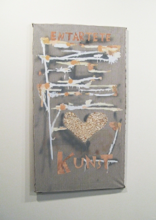 Peter Gallo, Entartete Kunst, 2007 Oil, spray paint and egg shells on bed ticking Private Collection; courtesy of the artist and Sunday L.E.S, New York | |||