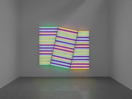 In his exhibition Medley, the artist introduces a dozen objects that are representative of his artistic practice. Central to his oeuvre is the juxtaposition of high art and low culture. Lavier borrows motifs from the canon of art history (a painted mobile evoking the work of Alexander Calder, a neon sculpture made after a painting of Frank Stella, a lithograph of Joseph Albers painted over, etc.) as well as from popular culture: Walt Disney cartoons for example. For The Walt Disney Production Series his point of departure is a cartoon from 1947 in which Mickey and Minnie Mouse are walking through a museum of modern art. The museum in the cartoon exhibits fictitious artworks with a modernist idiom. Lavier brings a number of these fictitious works, these Disney-style parodies of the art at the time, to life, turning them into autonomous sculptures and paintings.