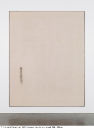 | DAVID OSTROWSKI DAS GOLDENE SCHEISS March 15 - April 19, 2014 Opening on Saturday, March 15th, 2014 5.30 - 8.30 pm For his first solo exhibition in Paris, David Ostrowski has decided to reuse the title he chose for his first solo exhibition which took place at Raum für Kunst und Musik in his hometown of Cologne, Germany, almost ten years ago. The title Das Goldene Scheiss contains a pun on the use of the articles der and das, and means ‘the golden shit’. It is also the title of a small figurative painting he did in 2004 which depicted a boy with a rolling pin positioned next to a white van against an abstract background. This painting no longer exists. It was destroyed a few years ago in a devastating fire in the artist’s studio, along with all his other works from that time. The twofold usage of the title is not only evocative of a renaissance but is also a reference to Ostrowski’s past and thereby underlines the coherence in his development. Since then he abandoned figuration, as if he had tested its limits and started to tackle those of abstraction. Nevertheless, Ostrowski hardly gives a thought to the status of his medium. What interests him is the act of painting itself. His works constantly allude to one another, reflecting and overlapping, as though to poke fun at and elude the issue of painting in general and of his practice in particular. This contradiction reverberates in the two elements that make up the exhibition’s title: gold and shit. Many of the paintings have the same title and form part of a series he calls F Paintings. We learn nothing more about this generic title, except that it seems to have simply been chosen because of a graphic affinity for the letter F, the artist’s favourite in the alphabet. Amongst other interpretations, F stands for ‘Frame’. Ostrowski frames most of his paintings and considers this element as part of the painting itself. Building the support for the work, assembling the structure, stretching the canvas and preparing it with the right coating are all part of the painting’s elaboration and completion. This is not the case for the works in the series Outline Paintings, subtitled F (A thing is a thing in a whole which it’s not). These works are not framed. They are thicker; their borders are wider and more self-sufficient, adding a sculptural dimension to the canvases. They all reproduce a similar drawing, consisting of a rectangle of spray-painted colour, following the paintings’ borders and four corners which symbolically frame either a black or white void. The artist uses the basic colours red, blue, green, black and yellow, which are often applied five times in the same, overlapping motif or sometimes in a single motive. The stroke is imprecise and serves to demarcate a space or the centre of the painting. This space is generally white but is sometimes filled in with a large black area. The German term for colour is ‘Farbe’. ‘I don’t really like these colours’, Ostrowski says. ‘I use them to get used to colour. I’m testing them’. The series F (Between two Ferns) is probably one of the artist’s most emblematic so far. It consists of an endlessly repeated motif that has been spray-painted in blue on a white background. The process of choosing titles is part of the paintings but often stays unintelligible for the viewer. F also stands for ‘Failure’. Ostrowski does not always successfully pull off his paintings. Each one is a new challenge, and he has only one chance to get it right. He does not spend all his time painting, but also contemplating, reading and listening to music – any kind of music – from country to rap, German pop to Taylor Swift, who has also become incorporated in a title: F (Taylor Swift). Ostrowski’s approach to painting is unpredictable. When the artist is ready, he sets to work. Sometimes a simple coating of lacquer will suffice, or a straightforward drop of gloss paint, a piece of tape torn off a white background, a hessian canvas with water stains, or a piece of paper stuck to the canvas. Ostrowski works at the limit of painting, paintings which are sometimes not even painted. Meditative and sensual, the act of painting is reduced to its simple constituents, the sometimes invisible atoms of information of a whole which it wishes to convey. Ostrowski reaches the core of painting by drastically simplifying its effects. The list of names and adjectives that make up the series of F Paintings continues. Take F for ‘Foot’, for instance. Ostrowski is obsessed with women’s feet even though he claims not to be a fetishist. When a woman visits his vast studio, he will sometimes ask her to walk on a canvas, thereby leaving her footprints upon it. The canvas will be complete with that fleeting, dusty trace that forms a new episode in the series F (Even the most beautiful woman ends at her feet). F also stands for ‘Format’, his favourite being 240 x 190 cm. It is always consistent, and he repeats this format here for his Paris exhibition. F also stands for ‘Flying’. Ostrowski sometimes wants his paintings to fly and accomplishes this by occasionally hanging them from the ceiling in the middle of the exhibition space. However, true to his contradictions, Ostrowski is also willing to have them placed on the floor. In the studio, they rest on empty spray paint cans. ‘Hanging is like a puzzle’, says the artist. ‘There’s only one solution and no plan B’. Nicolas Trembley ***** Pour son exposition parisienne, David Ostrowski a choisi de réutiliser le titre qu’il avait donné à sa toute première exposition personnelle, il y a presque 10 ans, à Cologne, sa ville natale, à la Raum für Kunst und Musik. Das Goldene Scheiss, joue poétiquement sur une erreur de pronom en allemand et signifie « le merde doré ». Il s’agit également du titre d’une petite peinture figurative de 2004 qui représentait un garçon avec un rouleau à pâtisserie, dessiné à côt