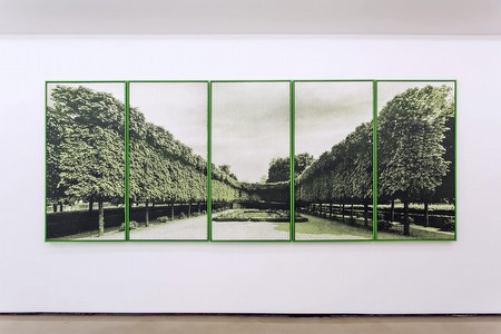 | ELIZABETH CORKERY Pictures of Pieces Preview: Thursday 4 June, 2015 / 6-9pm Exhibition Dates: 5 June - 25 July, 2015 Elizabeth Corkery’s first solo exhibition with Beers addresses key concepts from from the artist's practice, including ideas concerning the understanding of architectural space, the reproduced image, and the potentially fraught task of representing three dimensions in two dimensions. In a broad sense, Corkery's practice is one that can be broadly articulated as a continuous and considered mediation of pictures: reproduced pictures, generated from other pictures, or those suspended and separated from their original context. Trained as a printmaker, much of Corkery's work concerns a language that arises through repetition, reproduction, and simulation of 'The Image'. Through a variety of spatial investigations, the work reconsiders the architectural environment as merely a static backdrop through which temporal activity takes place, as though the work operates as a site for the convergence of spatial and representational experience.The works largely employ the medium of silkscreen, either printed on paper or directly onto the rigid surface of thin MDF panels. Scale fluctuates as pieces assume the role of representation, structure or set in a careful negotiation between the display of pictures and pictorial illusion. Upon entering the gallery one is met with Pellerin Curtain (2014), a small gouache illustrating a closed theater curtain, indicating that action that has either recently concluded or is perhaps about to take place. This early reference to the stage is a pertinent one, as Elizabeth’s practice is one that often looks to expose its own production or mode of display, we are privy to the edge of the theatre set, but are also seduced by the potential for transportation. The larger pieces’ in this installation prompt a suspension of disbelief that enables the viewer to see both the picture and the object itself, pushing at the “extent (to which we) can retain our awareness of the means and see the representation at the same time?”[1] Many pieces are either displayed as multiples or as multi-print series, Laurentian Repeat I and III consist of nine large-scale screenprinted panels that take their visual cue from photographic documentation of Michelangelo’s Laurentian Library. Sourced imagery of the staircase is cropped and screenprinted directly to thin MDF panels. Instead of presenting a pictorially convincing scene of receding space, the imagery’s flatness is heightened and the panels move up the wall in perfect repeat. Using the theatre and the garden (both quite cultured and cultivated areas of performance and ceremony) as an evocative and heavily laden site of inquiry, Elizabeth builds upon an almost playful, unassuming thematic foundation, as a structure to simultaneously look whilst physical exist within a staged, wholly fabricated context. Much of this lends to the historical studies around landscape architecture as a current field of research, while harkening back to historically imbued sites such as the gardens of Versailles, or even fantastical avenues of inquiry like the apocryphal and ancient Hanging Gardens of Babylon. The large five-panel screenprint, Hedge Theater II, draws from similar pictorial investigations. They share a scale that establishes for the viewer a bodily context however as they approach a “life-size” scale there is a breaking down of the halftone printed reproduction. As the images enlarge to approach the scale necessary for pictorial illusion, the make-up of the image starts to give way and the corresponding and overlapped dots that make up the picture plane disperse and separate, resuming their role as regulated geometry. As one moves through the installation, smaller pieces jump cut to larger ones, pieces are either contained within frames or provide their own rigid structure; pieces march up the walls, lean or are stacked as if awaiting further action. The work reminds of contemporary sites like Berlin's Pergamom, in which entire ancient ruins have been reconstructed within a museum-space, pushing the boundary between history, reality, and simulacra into fantastical extremes. Now, engaging with film as a structural and temporal connector, Corkery frames the 'experience of existence' as the semiotic moments of incalculability: our recollected experiences within a particular space; personal memory triggers; those split-second cuts between cinematic shots. Here, the viewer places himself within the framework, not unlike the famed and much-theorized Panopticon (the ill-fated 19th Century prison which posits the prison guard at the nucleus with an encirculating ring of cells ) Corkery suggests that this panoramic perspective allows the maximum potential for situating oneself amongst the action. Throughout her imagery and installations, Corkery has combined free-standing structural forms that engage with a physical and present experience, with printed, pictorial representations that connect to time past; a space that has previously been visited or traversed and whose spatiality is now limited to two dimensions where ultimately the viewer becomes the locus for memory, idea, and history. [1] Gombrich, E (1996); 154 Biography ELIZABETH CORKERY (b. 1986, Sydney, Australia) received her MFA from Cornell University, Ithaca, NY in 2013 where she was the recipient of the John Hartell Graduate Award in recognition of excellence in graduate studio practice. She moved to the United States in 2004 after completing her BFA (Hons) in Printmaking from the College of Fine Arts, Sydney, spending two years living and working in Brooklyn, NY before commencing her graduate studies. Elizabeth has received production and research funding from The Elizabeth Greenshields Foundation, Brooklyn Arts Council, Somerville Arts Council, Cornell Council for the Arts and Australian philanthropic organizations The Dame Joan Sutherland Fund, The Ian Potte