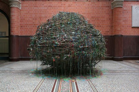 Mhairi Vari �Hub� gazing ball, twigs, hot-melt glue, approx 150x150x150cm, 2011 installed at Birmingham Institute of Art and Design, Wheatley Fellowship Exhibition | |||