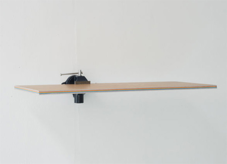 | If.... Alistair Owen 16 March - 2 April 2011 For the final installment of the If�. programme, as g39 begins the process of relocation, it is fitting to have a new body of work from Alistair Owen. Alistair's practice uses a wide range of media including installations, drawing, photography, film and sculpture. His recent work offers observations on how we adorn and configure our personal territory. Living in a modestly sized basement flat in London and not having access to a studio has created a symbiosis between habitat and production. The work has, by necessity, to be modest in scale and materials. For many artists there is a decision to be made about the longevity of their work, once it is shown where does it locate itself afterwards? For much work it is the studio, loft, garage or skip that becomes the final resting place, sometimes being rescued and brought back to life for a short time, sometimes being left to the quietude of a physical subconscious. There is a sense of relegation or banishment to a remote region. But for the work in this show there is some continuity of purpose, both before and after the life of the show. Owen�s bedroom is also his studio and the work for this show has its genesis, location and relocation there. The work is cohabited with and forms part of the daily fabric of his life. A shelf held by a vice uses the surface veneer of mass production but is made from layers of coloured card that displays a thin rainbow seam along its edge (Shelf2). The colours in this seam are released into two further pieces, a found photograph of g39 (Untitled) and opposite in the stairwell a floorplan of the bedroom, depicted in glossy blocks on a cloth ground (Untitled). And on the back wall, an animated film in a shoebox gives us a 360o view of the basement bedroom-studio. In this endless dervish-like rotation we can see the works contained in g39�s larger space mirrored in this smaller one, both location and relocation present and co-existent in an endless cycle. | ||||