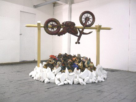 | LONERS' ISLAND Gordon Robin Brown, Lloyd Durling, David Marchant, Alex Gene Morrison, Dan Mort, Miranda Whall Curated by Mermaid and Monster Accompanying text by Leona Jones Preview: Friday 23rd November 6.30-9pm Open Wed to Sat 11-5.30 until 12/01/08 NB Closed between 16/12/07 and 03/01/08 Loners' Island is a place familiar to many artists and audiences. It is a place of melancholy, danger, wonderment and disinterested curiosity. It is full of discovery, boredom and potential pitfalls, an aesthetic and conceptual island where both spectator and creator is dragged between extremes of naivet�, mean-spirited sophistication, calculated ugliness, the sublime and the ridiculous. Gordon Robin Brown makes satirical and surreal paintings which combine a curious mix of elegance, humour and eroticism. The works pose bizarre narrative scenes depicting a strange, compromised paradise where both human and animal characters are set in private folkloric ensembles against vast expanses of colour. The large-scale acrylic paintings and small ink watercolours are drawn with a clarity of line and refined draughtsmanship; ideas come through doodling and sketching, often drawn directly onto canvas with no predetermined plan. Brown works instinctively, responding to ideas as they suggest themselves as he works. In one painting, it seems as though the world of Beatrix Potter has collided with The Joy of Sex. Lloyd Durling's delicate and minutely detailed biro drawings explore the way in which many artists are currently dealing with the meaning of landscape. The fantasy elements of his work, their magical extravagancies and gestural filigrees are juxtaposed with brutalised visions of humanity and environmental destruction. The complexity of these works offers a poised view of a world that is simultaneously perfected by technology and destroyed by modern warfare and industry. David Marchant�s work embraces technology and also questions it. He uses simple, recognisable objects reworked to engage with complex issues. He also uses video and performance to question identity and challenge possible public oppression. Known for his slick and slimy pictures of mutant creatures, Alex Gene Morrison lures his audience into a world of melting heads, rotten carcasses and giant flies. The idea of seduction and repulsion is very important to Morrison. His paintings, collages and animations brings the audience into a visceral experience and then keys into some of the base, yet very powerful human emotions such as desire, fear, disgust and wonder. Dan Mort describes his work as �possible sculpture�. Playfully fusing disparate items, materials and modes of production, his pieces often reference familiar modernist strategies that are thrown off balance by the inclusion of unexplained elements. sheer materiality and a sense of the arbitrary play against the works� potential as signifiers. He wants to consider whether determined conditions of viewing inevitably force the assignation of contextual or symbolic resonance, or if the resulting work could in fact be understood as nothing more than stuff, arranged �sculpture-wise� in vacuous, quasi aesthetic configurations. Miranda Whall's videos, photographs and drawings create unique contexts in which to represent specific relationships between herself, nature and the wider external environment. Self-portraits absorbed in the scatological necessities, autoerotic pleasures and the pragmatic monitoring of her fertile conditions are played out and coexist alongside arbitrary and seemingly indiscriminate non-hierarchical groupings of images and objects such as birds, farm machinery, rural architecture and transport. Whall, often humorously, attempts to establish an equality between herself and her co-habitors or locality. She is interested in purposefully ignoring the boundaries that exist between her and other things and through doing so questions what and where it is appropriate and inappropriate to be female. If Loners' Island has more than one resident, then surely it becomes a small community of likeminded souls with connections between the artist and audience. Not so on this desolate, rather disturbing isle, where each artist would rather die a honourable death or eat his or her young than become part of the general consensus. Each artist here stakes their own idiosyncratic claim on Loners' Island, where their work can fight internal battles and say, This is this, this isn�t something else. | ||||