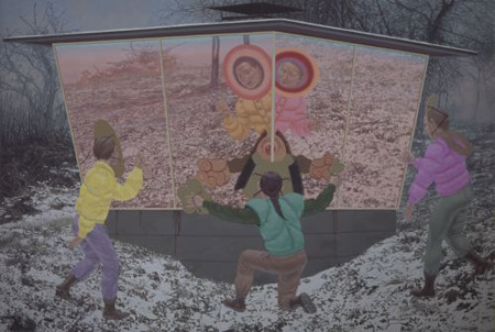 | Simon Pasieka - � 8 � Opening reception: Friday, May 30th from 7.30 pm Duration of the exhibition: May 30th - June 28th, 2008 We are very pleased to present new oil painting by the artist Simon Pasieka who therewith expands his work which up to now was mainly constituted by ink drawings. The image as if a mirror, reflected in the water or by looking into one, has always been popular in displaying modes of knowledge or the recognition of the self in painting. As described by Jacques Lacan in his theory of the mirror stage the identification of the self is only provided by the first look into the mirror; the idea about the self therewith is based on an image, on an imagination, moreover on a imagination of one's self as a unit of the body which will only develop in the course of life though. As a child or a young person, we are still far from this unit; our image in the mirror is only the first stage to practice the layouts of our self in order to finally arrive to a more global picture. The game and the theatre are the spaces of the imaginary in which the young protagonists in Simon Pasieka�s paintings move. Before colourless walls in barren winter landscapes they find themselves joined together in the game of masquerade, their mirror images bringing for a brief moment the bizarre formation of a new physical unit. Like in many of his ink drawings the artist shows small groups � absent and deeply committed to their game � in an original and natural environment. Whether playing with the mirror as in "8" or the two Aztec-styled young people demonstrating for their viewers as in the work "Wirbel / Vortex", they always seem complacently recognise themselves in their own game while concurrently be willing to exclude themselves from to the outside world. In addition to his ink drawings Pasieka uses the oil to manage through the bright colours of his character�s clothing and utensils an additional distance between them and their natural environment. At the same time he lets them mark their territory, in whose limited space both game and transformation can happen. Tasja Langenbach Kota Ezawa / Philipp Grammaticopoulos / Yves Netzhammer - Animation in Videoart Using the computer as a painterly tool to create 3-D imaginary structures in the data space, Kota Ezawa, Philippe Grammaticopoulos and Yves Netzhammer explore our perception of the world and the possibilities of representing it today. They offer us a virtual and fictional world for all kinds of encounters and provide us with an exemplary reflection about today�s informational world we live in. Run by its specific laws, Yves Netzhammer's compelling yet constantly changing mental landscapes show multifaceted recurrent metaphors � black birds, dark shadows, spurting blood, flying balls i.e. - which result both strange and fascinating and unbalance our own sense of familiarity with things. Posing questions into human memory and exploiting themes as illness, love, sexuality and death � abstractions themselves � Yves Netzhammer establishes a new kind of �picture language�. Yves Netzhammer succeeds thus, in linking questions originally connected with new technological developments together with an insight to psychological and cultural historical content. Also exploring the ways we use history and its constructions, the San Francisco-based artist Kota Ezawa describes his own practice as a form of �video archaeology�. Using iconic archival news or film footage, Ezawa addresses how we only remember the past through mediated images � from television, newspapers, cinema i.e.- and the dangers which entail from it. The same way as a moving Warhol silkscreen or a South Park cartoon, Kota Ezawa�s video animations employ few colours and details to inquire the power and overlap of popular culture, political action and high art. As a sort of digital approximation of paper-cutout animation, vibrantly coloured and stylized, his flat images are patiently recreated by hand � a single video can take up to a year to be finished � and finally presented to the viewer as a digital projection or a film, or a slide show. Ultimately, such laboriously technique is questioning how � in a culture charged with technologically mediated images - certain images prevail in our collective memory more than others and how rapidly they are replaced. In �Le Regulateur�, Philippe Grammaticopoulos, who was born in 1970 and studied at the renowned academy for animation film Supinfocom in Valenciennes, places his characters in an architectural scenery animated in black-and-white. In search of the perfect child, a well-to-do couple visits a reproduction factory to have their offspring built together like on the assembly line. Citing a classical temple structure in the architecture, Grammaticopoulos reflects on current debates on the future limits and possibilities of reproduction. Kota Ezawa, Philippe Grammaticopoulos and Yves Netzhammer seem to share the same attraction to animation exactly because of its �constructed� nature. They eagerly explore their tools, consciously leaving some aspects hidden in order to bring out more decisive ones, leaving only the most basic indexical values in the end. Playing with recognisability and fictionality, their choices are not innocent nor without consequences� Liliana Rodriguez | ||||