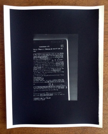 | EVE K. TREMBLAY EKTBF451/EKTFF451: NOTES AND CONFESSIONS 05.12. - 23.12.2014 Eve K. Tremblay’s multimedia project Becoming Fahrenheit 451 started in 2007. Similar to many of her other works, it was triggered by an accidental event from the artist’s former nomadic life and sharp observations of her close surroundings; in this particular case, the encounter with a video-rental store in Berlin, in the neighborhood Tremblay was living at the time. The store’s name, Filmgalerie 451, was indeed symbolic; it referred to the name of a famous Sci-Fi novel by Ray Bradbury (in the 1960s loosely adapted into film by François Truffaut) that describes not that distant future in which books and reading are treated as a threat to society’s peacefulness; as a disturbance that supposedly leads to uneasiness, doubt, criticality and consequently misfortune. Therefore, the books needed to be destroyed by specialized squads of firemen; only small groups of dissidents, the so- called “Book People,” had the mission to preserve the books from obsolescence in immaterial form- in their minds, through the specially developed photographic memorization method- in spite of being prosecuted. The event of running across this store in Berlin generated remembrance of Bradbury’s book that Tremblay indeed read a long time ago. This became a starting point for several years of the artist’s immersion into contemplative, playful as much as persistent quest of memorizing Fahrenheit 451, in a metaphorical attempt of “becoming a book.” It engaged the artist’s interests in literature, theater, philosophy and visual arts as much as scientific texts, neuroscience, history of mnemonic systems and mechanisms of remembering and forgetting. Here, poetical approach and philosophical contemplation come into play with constant material experimentations; the still evolving project comprises of numerous media such as performance, video, drawing, collage, sculpture, installation, text, ceramics as well as Tremblay’s most common medium of photography. For MK Gallery, Tremblay envisioned an all-encompassing presentation of her Becoming Fahrenheit 451, titled EKTBF451/EKTFF45 : Notes and Confessions. The exhibition starts with a letter, written and rewritten many times, to the writer Ray Bradbury himself. The letter is an invite for Bradbury to her exhibition, but also reveals, in almost diaristic form, the artist’s thoughts on the whole process of developing this project (as much as her reflections on art making in general) which she defines as “making and comprehending with grey matter” – both by her and by the public. The notes to Bradbury, as much as to herself, are also scattered throughout the exhibition in the form of post-it notes, creating peculiar and engaging juxtapositions of these short texts and imagery that surrounds them. These constellations feature Tremblay’s black and white and colored photographs and videos that had captured numerous days and months of memorizing the book (quite contrary to the fictional fast memorizing method of the “Book People” in Fahrenheit 451) and observing what was simultaneously happening in the artist’s mind, in private interiors of Tremblay’s ever changing apartment(s), but also in various locations during her travels. The images of numerous locales resonate the very process the artist chose for memorization of different parts of the book- by associating them with different locations and architectures from her past (the “memory palaces”.) One particular group of videos and photographs records the people from Tremblay’s surroundings; acquaintances, friends, and colleagues were asked to read and memorize parts of their own favorite books, in almost dreamlike compositions (some echoing the last scene of François Truffaut's adaptation to film of Fahrenheit 451). The artist’s camera captured those people while being immersed in reading, or performing different, sometimes even odd things with their favorite books. The photographs- interiors or scenic natural historical and industrial landscapes (some of them more directly suggesting particular episodes from Bradbury’s book)- not only depict the individuals in action; in them, the books- a recurring motif in all of the compositions- become characters themselves as being brought to life by some supernatural force. There are also some drawings in the exhibition, including Judo drawings (made after the portraits of Yves Klein - known for his deep involvement with Judo training - found on internet) that humorously adduce ongoing struggle with memory slippages (or maybe struggle with the years long project that cannot that easily be erased from the artist’s mind, in order to renew itself and develop new stores and focuses) as well as the compositions of empty memory cards (metaphors for forgetting), made through the physical act of destroying and erasing- traces of colorful and vivid memory cards which served in the process of remembering Fahrenheit 451, with images of backyards (again, particular loci) Eve was walking by on a daily basis while living in Bushwick quarter of Brooklyn, NY. In the exhibition, the memory cards are also presented, as well as the copy of Fahrenheit 451- the artist’s companion since 2007 (purchased by the artist in Mauer Park Floh Markt in Berlin as the already used book) with numerous lines, notes and marks made in different colors by the artist (to facilitate the memorization). These layers upon layers of time and gestures are magnified and underscored in photographic close ups of the book’s used pages, onto which the artists furthermore added remarks and scripts in the gallery space. Throughout the gallery, one can also find staged assemblies Tremblay’s “clay plays”- ceramic pieces with collages, drawings and video stills/photographs printed on them. Ceramics has indeed been fascinating material for this artist in most recent times, because of the specific properti