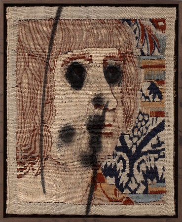 Claus Carstensen: Defaced Dorothy Margaret Swanson Feut 1968 Lore. 2012, spray on tapestry, 41 x 33 cm | |||