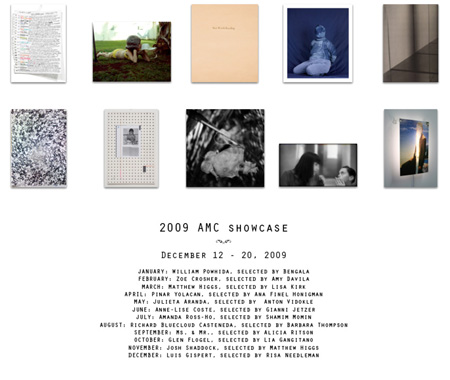 The AMC is a unique editions project that works like a subscription. Each month for one year, a different curator selects an artist to create a work of art exclusive to AMC. Artists ranged from the emerging to the established, encompassing a wide span of media, including photographs, prints, video stills, unique collages, letter-press and light installations�a striking variety that gives testimony to the diversity of new work being made today.