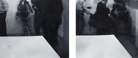 Johannes Kahrs, Untitled (four men with table), 2008; Oil on canvas (diptych) 77.76 x 93.5 inches (197.5 x 237.5 cm); 77.76 x 84.84 inches (197.5 x 215.5 cm)