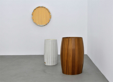 W�hrl, born 1974 in Munich, presents a new series of sculptures and wallworks. Reminiscent of barrels and kegs this minimalist group of works is made of found and formerly used doors in different colours and qualities, showing either shabby patina or high quality veneer. W�hrl�s contemporary, disrespectful but yet affectionate approach towards the modernist notion of sculpture and his affinity for crafts and traditional cultural practices feature him as one of the most important sculptors of his generation. In preperation for his show he visited the last active cooper in Munich, exchanging ideas about techniques, forms, history and future aspects of this disappearing craft.