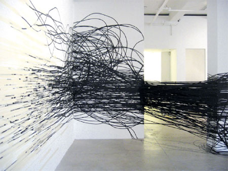 | MONIKA GRZYMALA: RUPTURES 19 February � 5 April 2009 The Drawing Room is delighted to announce Monika Grzymala�s first solo exhibition in the UK. Monika Grzymala�s installations function somewhere between an architectural intervention and immense line drawings. Grzymala�s installation for The Drawing Room is a personal response to the chaotic London sky-line, to the architectural space of the gallery and to the ideas explored in the Hayward Touring exhibition, �The end of the line: attitudes in drawing�, of which this commission is part. Grzymala describes each drawing in space in terms of kilometres of used line which references the personal investment of time and energy. For Ruptures the lines will be created from sticky tape in varying tones of grey, a nod to the predominance of grey in our city. These lines will be interrupted and converge on given points, collide and ricochet, sending out reports, staccato marks to bombard other areas. Miraculously the eye will fill in the gaps, create the continuum capable of maintaining the velocity of the multiple lines. The rectilinear properties of The Drawing Room will be ruptured by the maelstrom of activity that punctuates the space. This is a site specific installation commissioned by The Drawing Room to coincide with �The end of the line: attitudes in drawing� a Hayward Touring exhibition in collaboration with mima, Middlesbrough and The Bluecoat, Liverpool in association with The Drawing Room. The work will be linked to site-specific installations created at mima, Middlesbrough, (27 February � 10 May) and Bluecoat, Liverpool (22 May - 29 July). Monika Grzymala was born in Poland in 1970 and lives and works in Berlin, Germany. Recent exhibitions include a two-person exhibition at Catriona Jeffries Gallery, Vancouver (2008); group exhibitions at Transmission Gallery, Glasgow (2007); Marian Goodman Gallery, New York (2006) & The Drawing Center, New York (2005). She has just completed a residency at the Chianti Foundation, Marfa, Texas and is currently creating site-specific work with hand-made paper for permanent display at the Dian Woodner Collection, New York. http://www.t-r-a-n-s-i-t.net/ For further information please contact Mary Doyle or Kate Macfarlane on 020 7729 5333 or mail @ drawingroom.org.uk | ||||