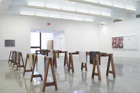 | Analia Saban : Backyard February 19 – March 21, 2015 Opening Reception: February 19, 2015; 6-8pm Conversation with the Artist and Johanna Burton, New Museum’s Keith Haring Director and Curator of Education and Public Engagement: February 21, 2015; 11am Tanya Bonakdar Gallery is pleased to announce the second solo exhibition of new works by Analia Saban. Presenting works on both floors of the gallery, Saban invites us into the metaphorical space of the backyard, in which the artist’s new works variously employ wood, marble, found household objects, pigments, and encaustic. In this new body of work, Saban continues to use the traditional elements of painting and sculpture to explore, expand and disrupt the properties of these media through alternative methods and processes. In the current exhibition, Saban brings her radical approach to the realm of the outdoor domestic scene, which becomes a backdrop for the artist’s storytelling. Engaging the history of painting and the possibility of art-making as an alchemical process, Saban continues her investigation of the line between painting and sculpture. Presented in the main gallery, the Draped Marble works employ material that has undergone a transmutation, its once solid form now more akin to fabric than stone. Here, Saban reinterprets traditional sculptural material in order to plumb its relationship to painting, specifically by exposing the minerals in the stone, linking this to pigments used by painters from earlier eras. Formally, the marble’s broken surface betrays variations in the crystalline structures of the stone itself, revealing a range of abstract patterns and rendering stone as canvas. Suggestive of a paint storage room, the upstairs project space presents work that examines painting and pigment through the medium of photography. In the works Scrapped (Paint Storage Room) and Markings (from Paint Storage Room) Saban scrapes the chromogenic emulsion from the photographic paper, manipulating photographic material as pigment. In Paint Cross Sections (from King Tut to Judy Chicago) the composition is built from cross-sections of pigments of famous artworks. Using research from the Getty Conservation Institute, Saban’s approach is akin to that of a scientist or forensic investigator for whom the imagery and information presents a time capsule, or even a portrait of the time at which the object was produced, including the tools and technologies of that culture. Each element of Paint Cross Sections reveals the textural quality of pigments as can only be seen under intense magnification, bringing to light the coarse grained material in Renaissance pigments juxtaposed with the silky, synthetic paints used by the likes of Andy Warhol and other 20th century artists. In the upstairs gallery, the backyard is materialized in a laser-cut diptych, whose imagery brings together elements referenced throughout the exhibition. Conceptualizing the domestic workspace of the backyard as a space for creativity and projects in process, Saban suffuses these ideas into works whose formal elements engage painting in its most minimal state. Bulge (Black) #1, Study for Vestige, and Vestige reimagine the painting as a container for paint, a theme central to Saban’s practice. These artworks serve as repositories and are infused with the surplus ink used to make the Paint Rag series, whose canvases are saturated with differing amounts of printmaking ink to yield their distinct textures. The Paint Rag works variously appear as the tools of painting or the consequences of creativity. The monochromatic palette of this presentation delves into the dichotomy of positive and negative, chromatically and formally. Throughout the exhibition Saban explores the modalities of painting, drawing upon its possible functions and tapping into its historical linkages in order to push beyond its perceived boundaries. Analia Saban (b. 1980 in Buenos Aires, Argentina) lives and works between New York City and Los Angeles. Currently, Saban is included in group exhibitions Variations: Conversations in and Around Abstract Painting at LACMA, CA (through March 22, 2015) and the upcoming Vibrant Matter at Kiosk in Ghent, Belgium (February 14 thru March 29, 2015). The artist was recently featured in Prospect.3 New Orleans, Contemporary Arts Center, New Orleans, LA and An Appetite for Painting, National Museum of Norway, Oslo. Recipient of the Norton Museum’s 2012 "Rudin Prize For Emerging Photographers,” Saban also participated in the Hammer Museum’s, Made in LA group exhibition in 2012. Saban’s works are represented in the collections of the Hessel Museum of Art at Bard College, the Hammer Museum at UCLA in Los Angeles, Museum of Contemporary Art in Los Angeles, Norton Museum of Art in Florida, and Los Angeles County Museum of Art. In 2016, Saban looks forward to her first major solo museum exhibition at the Blaffer Art Museum at the University of Houston, Houston, TX. | ||||